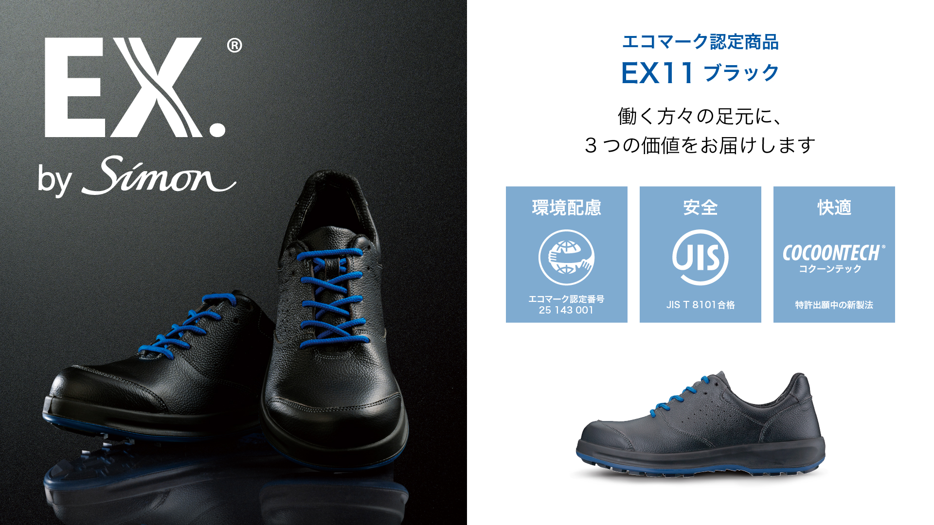 2025年には最新モデル「EX11ブラック」がエコマークを取得。特許出願中の独自製法と高く評価されている3層構造の靴底により、働く人の足元に「環境へのやさしさ」「安全性」「快適性」という3つの価値を提供しています。今後も環境と人にやさしい安全靴の製造・開発を通じて、持続可能な未来の創造に貢献してまいります。