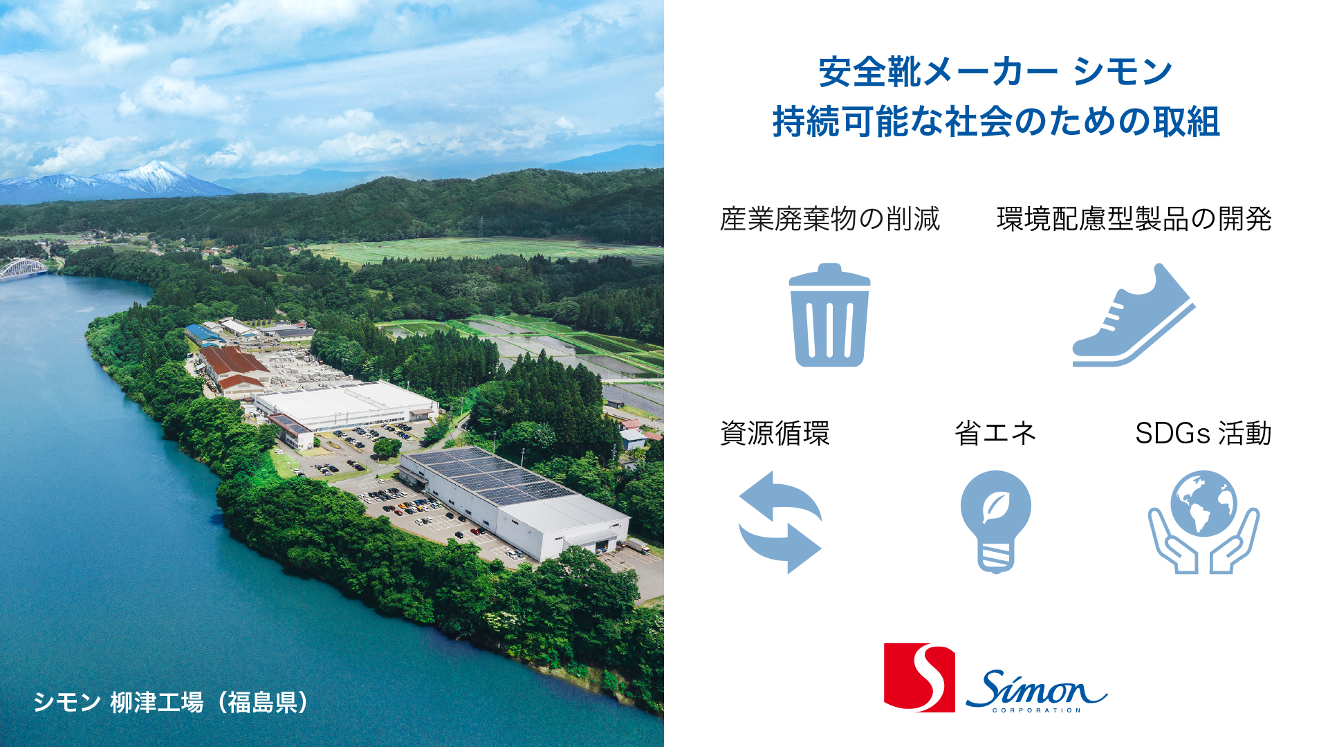 1948年創業の安全靴・作業靴・作業用手袋のメーカーである株式会社シモンは、快適性、安全性、耐久性という高い製品価値を備えた最新モデルの安全靴でエコマーク認定を取得した。この認定は、クロムフリーレザー、GRS 認証(Global Recycled Standard)のリサイクル素材を用いたインソール、リサイクルポリエステルを使用したシューレースの採用、製造工場での太陽光発電を導入するなど、製品や生産工場全体で環境負荷低減を追求した結果である。